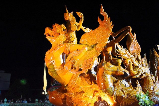 สำหรับถ้วยพระราชทาน 6 รางวัล ประกอบด้วย ถ้วยรางวัลชนะเลิศการแข่งขันเรือยาวประเภท 30-32 ฝีพายและประเภท 20-22 ฝีพาย ถ้วยพระราชทานรางวัลชนะเลิศการประกวดพุ่มผ้าป่า ถ้วยรางวัลชนะเลิศการประกวดเรือพนมพระทางบกขนาดใหญ่ ขนาดเล็ก และประเภทความคิดสร้างสรรค์ จากนั้นได้มีการแสดงทางศิลปวัฒนธรรม เรือพนมพระทางบก นางรำ-นางลาก พร้อมการแสดง แสง สี เสียง ประกอบเรือพนมพระทางบก จำนวน 5 วัด และนำขบวนมาโดยขบวนรถต้นเทียนพรรษาจากจังหวัดอุบลราชธานี สุดตื่นตาตื่นใจ ตามด้วย รถพนมพระและขบวนนางรำนางลาก จำนวน 5 ลำ จากวัดโพธาวาส วัดโพหวาย วัดหน้าเมือง วัดท่าทองใหม่ และวัดกลางใหม่ สร้างความประทับใจแก่แก่ประชาชนและนักท่องเที่ยวที่มารอรับชมเป็นจำนวนมาก ขอเชิญชวนพี่น้องประชาชนและนักท่องเที่ยว ร่วมสัมผัสมหกรรมงานบุญครั้งยิ่งใหญ่แห่งภาคใต้